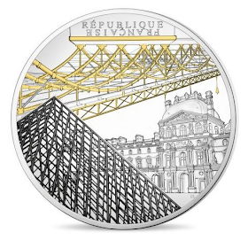 The Obverse of the 10 Euro Silver Coin depicts familiar elements of the edifice of the Louvre Museum along with the recently added triangular glass pyramid, completed in 1989.
