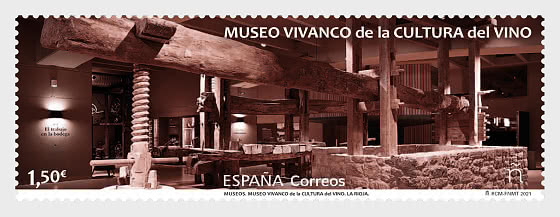 The stamp shows one of the Museum's rooms dedicated to work in the wineries.