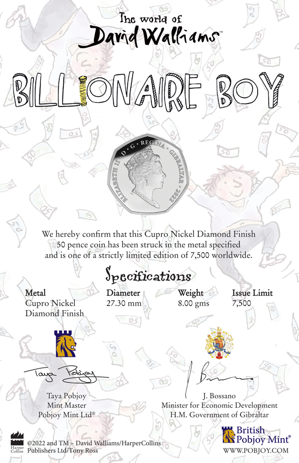 Country of issue: Gibraltar; Year: 2022; Coin Series Theme: "The World of David Walliams" (Best Selling Author); Coin Theme: "Billionaire Boy" (Children's story) - Third in a seven Coin Series; Denomination/Face Value: 50p (Fifty Pence); Metal Composition: Cupro-Nickel Diamond Finish (CuNi) & Coloured Proof Sterling Silver; Weight: 8.00 grams; Diameter/Size: 27.30 mm; Coin Quality: Unc. Cupro Nickel Diamond Finish Coloured & Proof; Mintage: 7,500 pieces; Presentation Box/Case: Yes, Presented in a special pack; Certificate of Authenticity (COA): Yes.