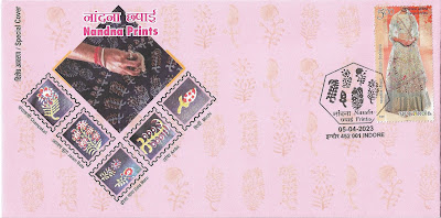 The special cancellation postmark/handstamp is of Indore Post Office and shows the Nandna prints in the centre. The date of cancellation is -"05.04.2023".