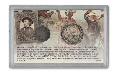 Custer's Last Stand - Coins presented against a scene of the Battle of Little Big Horn.